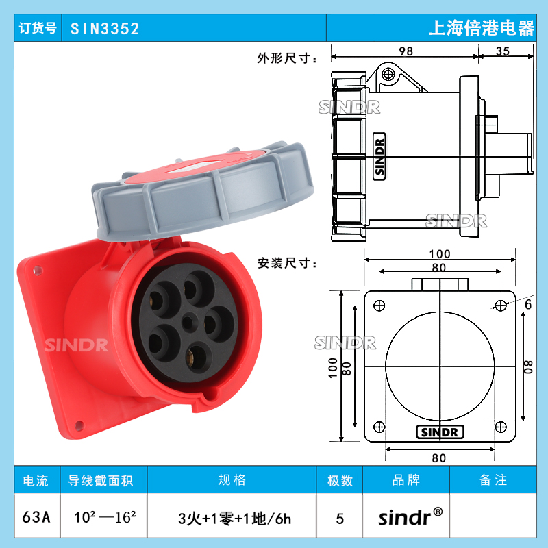 SIN3352_63A5P_ip67工业暗装直座Panel mounted socket